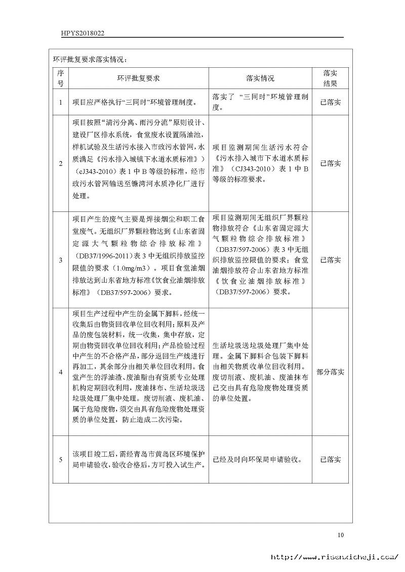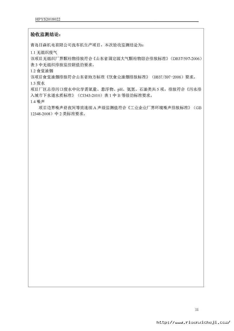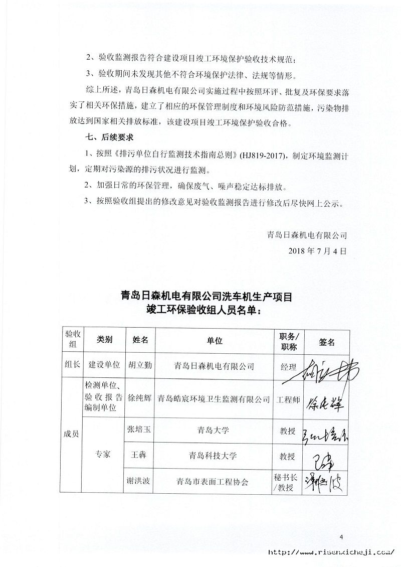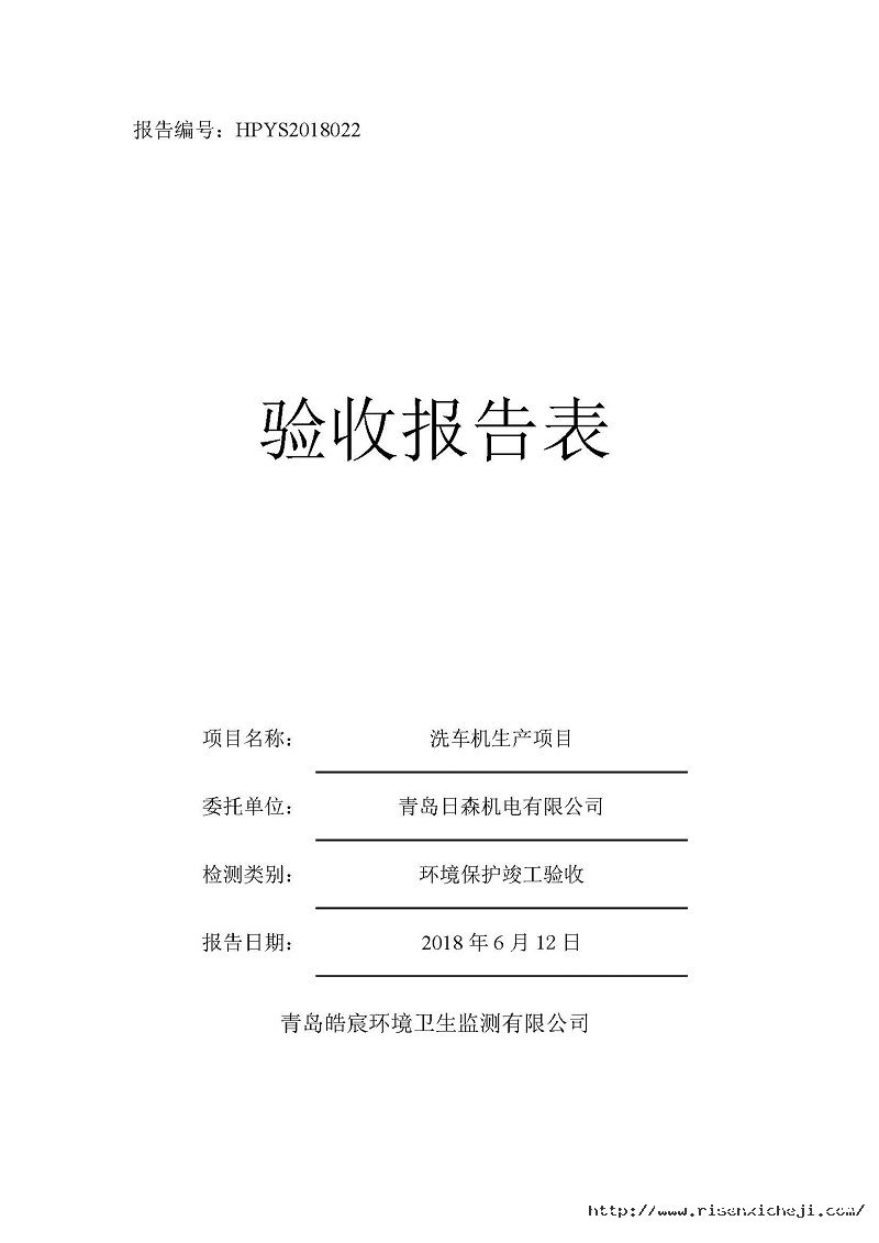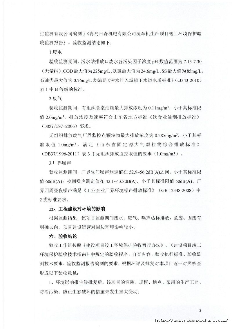 青島日森機電有限公司洗車機生產項目竣工環境保護驗收意見
