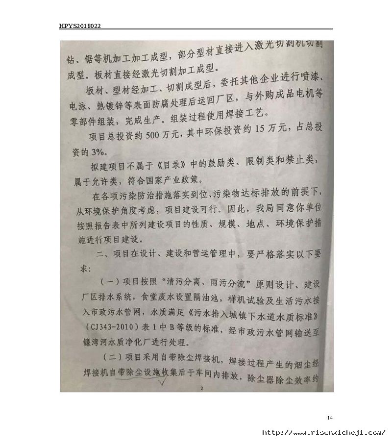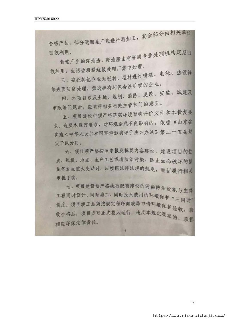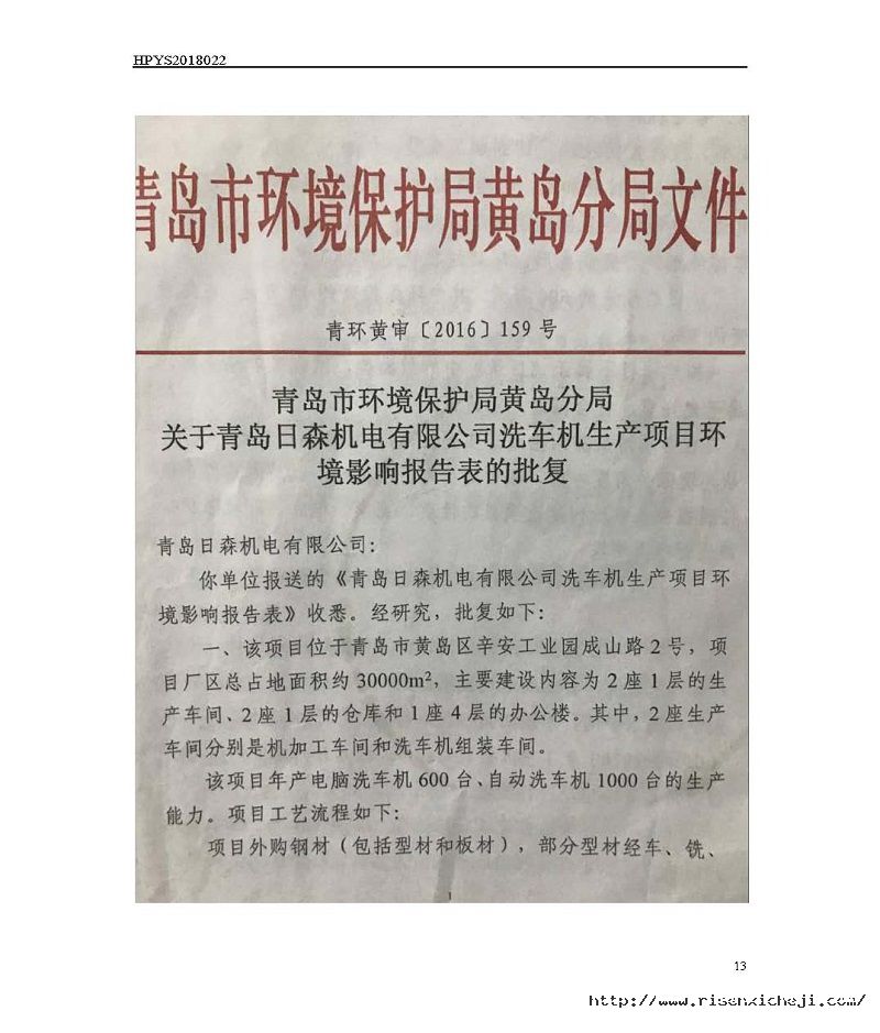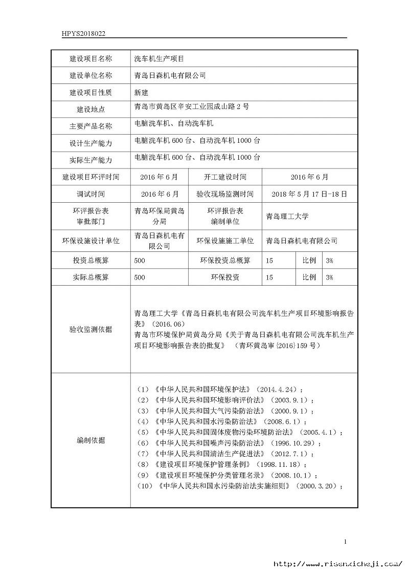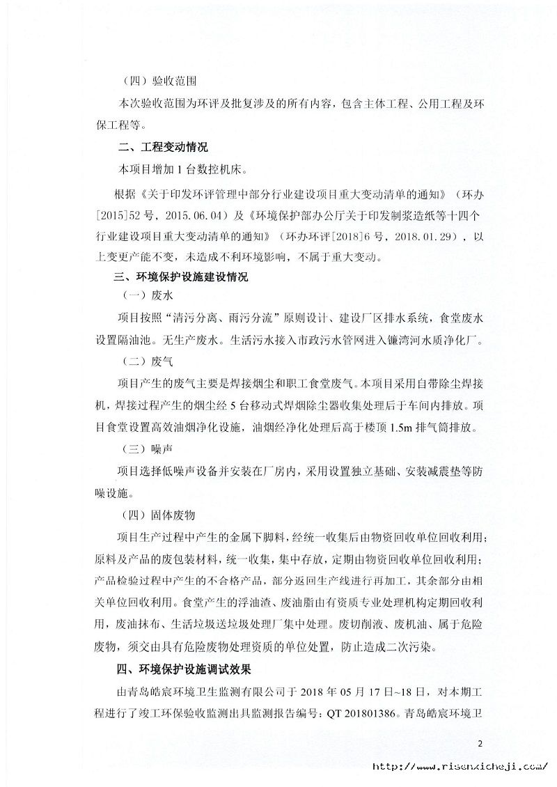 青島日森機電有限公司洗車機生產項目竣工環境保護驗收意見